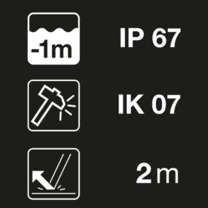 Toz geçirmez ve su geçirmez (IP67), darbeye dayanıklı (IK07) ve 2 metreye kadar düşmeye dayanıklı kafa feneri, profesyonel çalışma koşulları için idealdir.