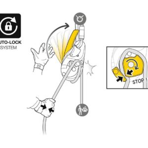 AUTO-LOCK sistemi, kullanıcının iniş koluna müdahale etmeden veya aleti çıkarmadan ipin otomatik olarak sıkışmasını sağlar. İniş kolundaki otomatik dönüş sistemi aletin yanlışlıkla takılması riskini azaltır