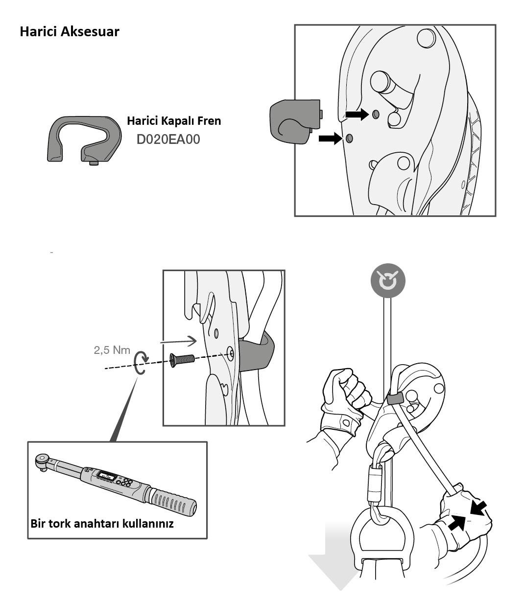 Harici açık fren mekanizması, kullanıcının yükün ağırlığına ve ip çapına göre sürtünmeyi artırmasına ve istediği zaman bir ip takmasına veya bırakmasına olanak tanır